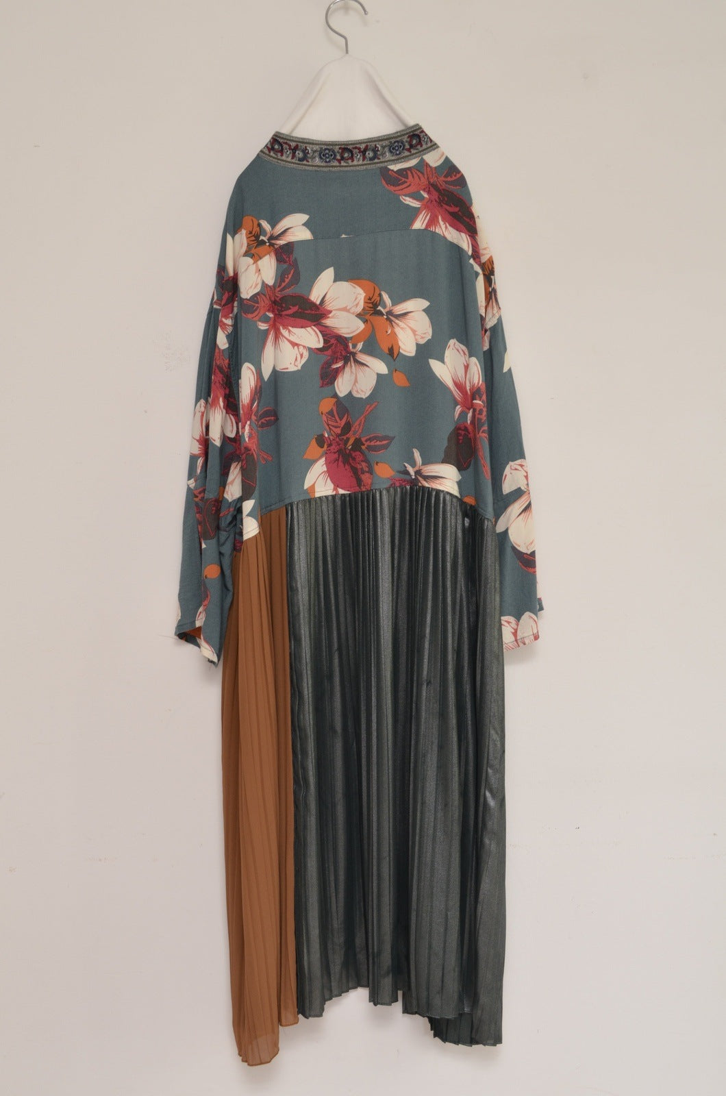 夏らしいusedアロハシャツをベースに2種のusedプリーツスカートを配しロング丈に。