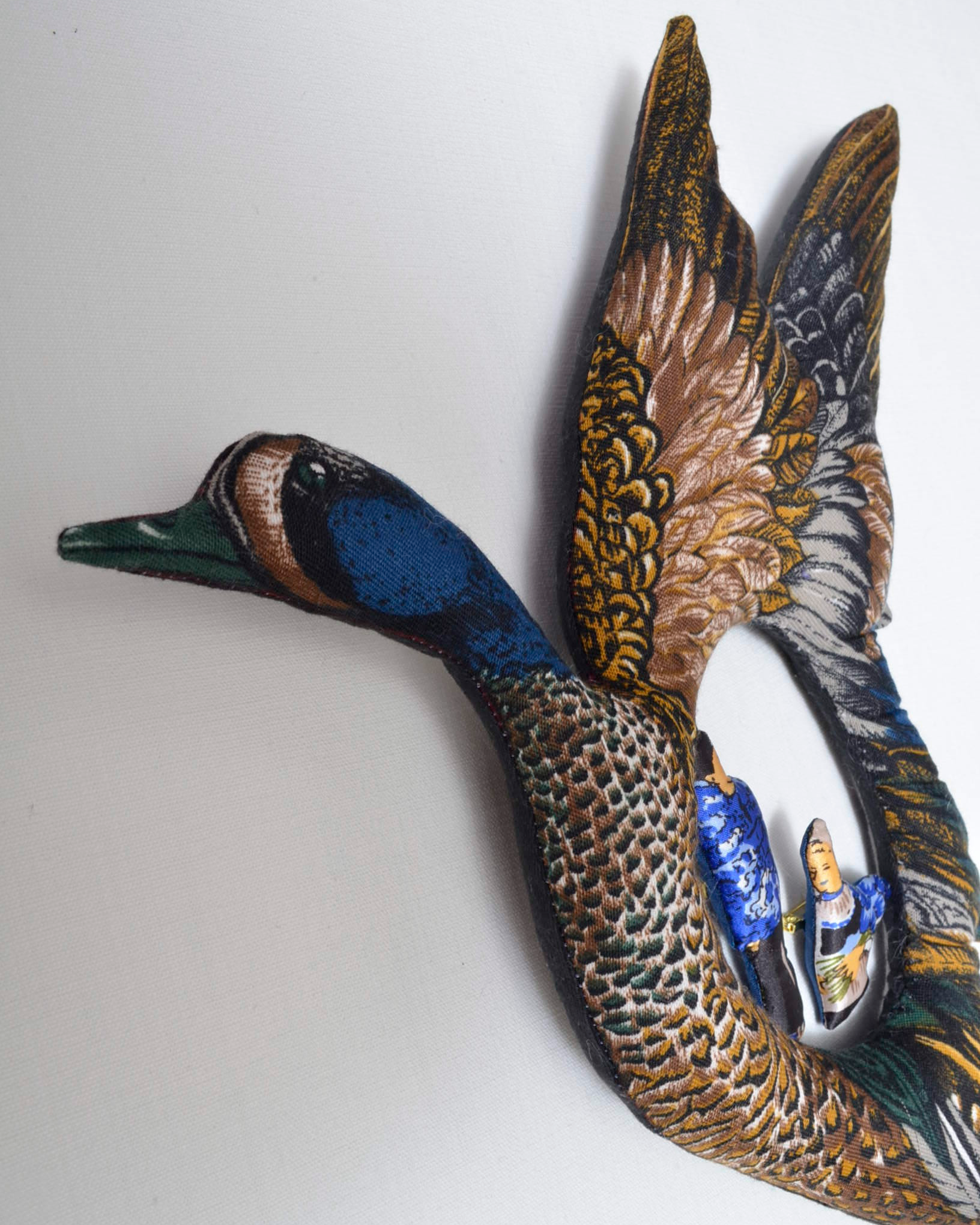 鴨(DUPE)のフレームの中に青い花束を抱えたふたりのブローチ。