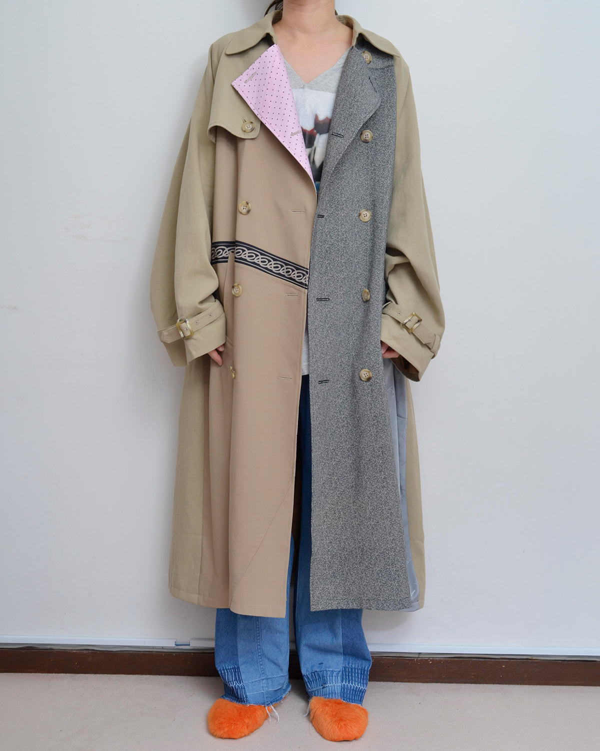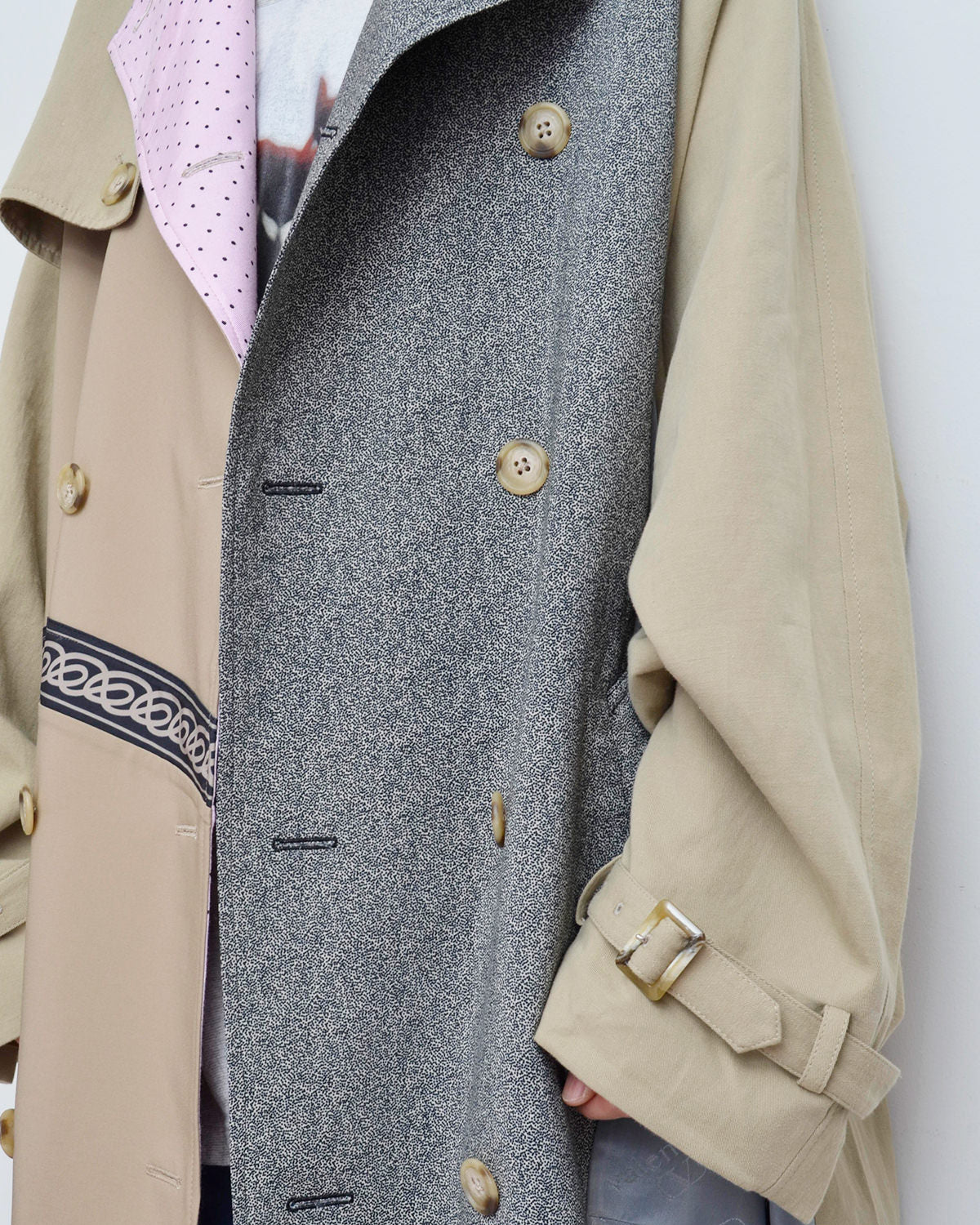 前身頃にusedフローラルスカートを解体して配したトレンチコート。