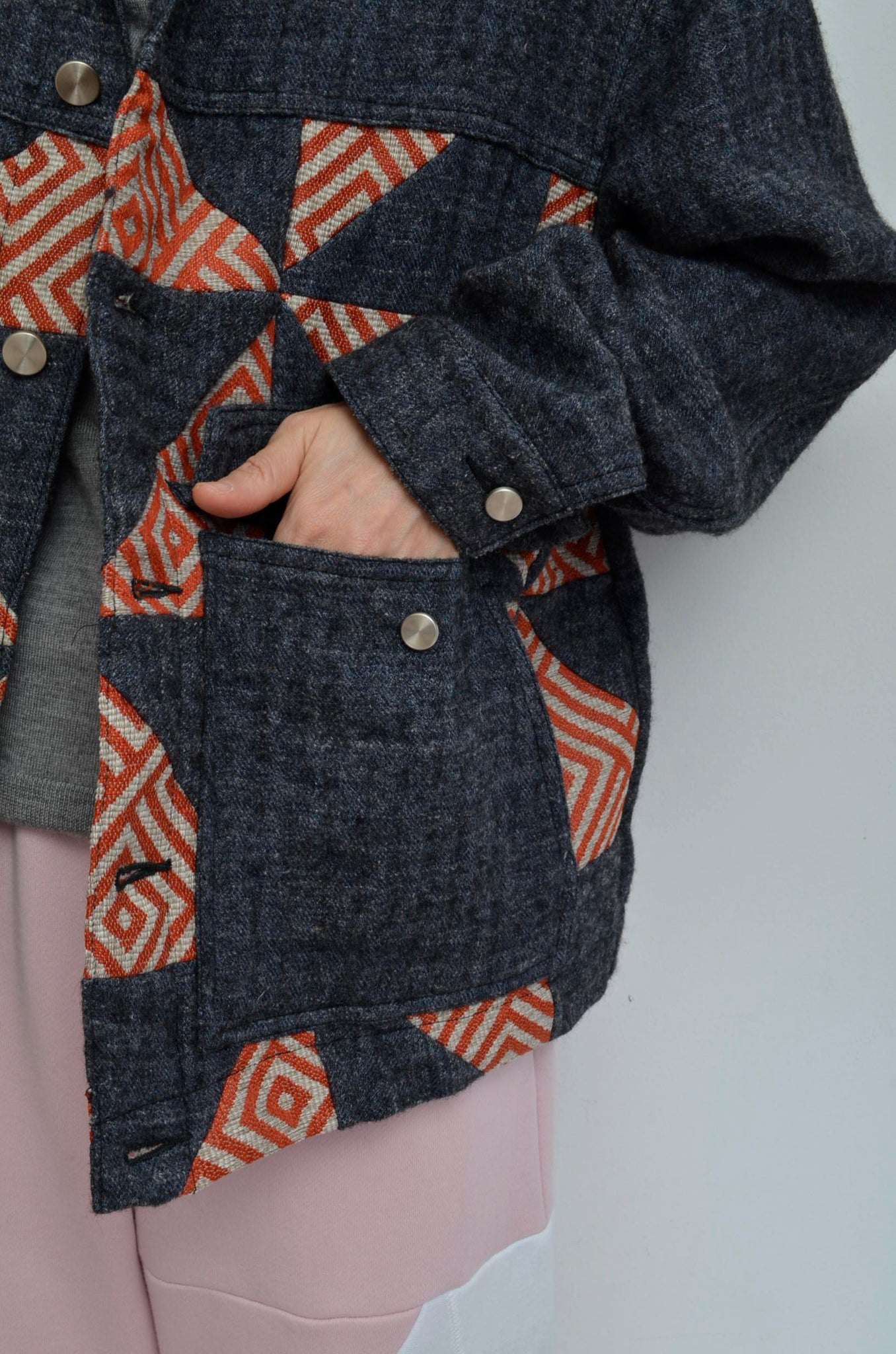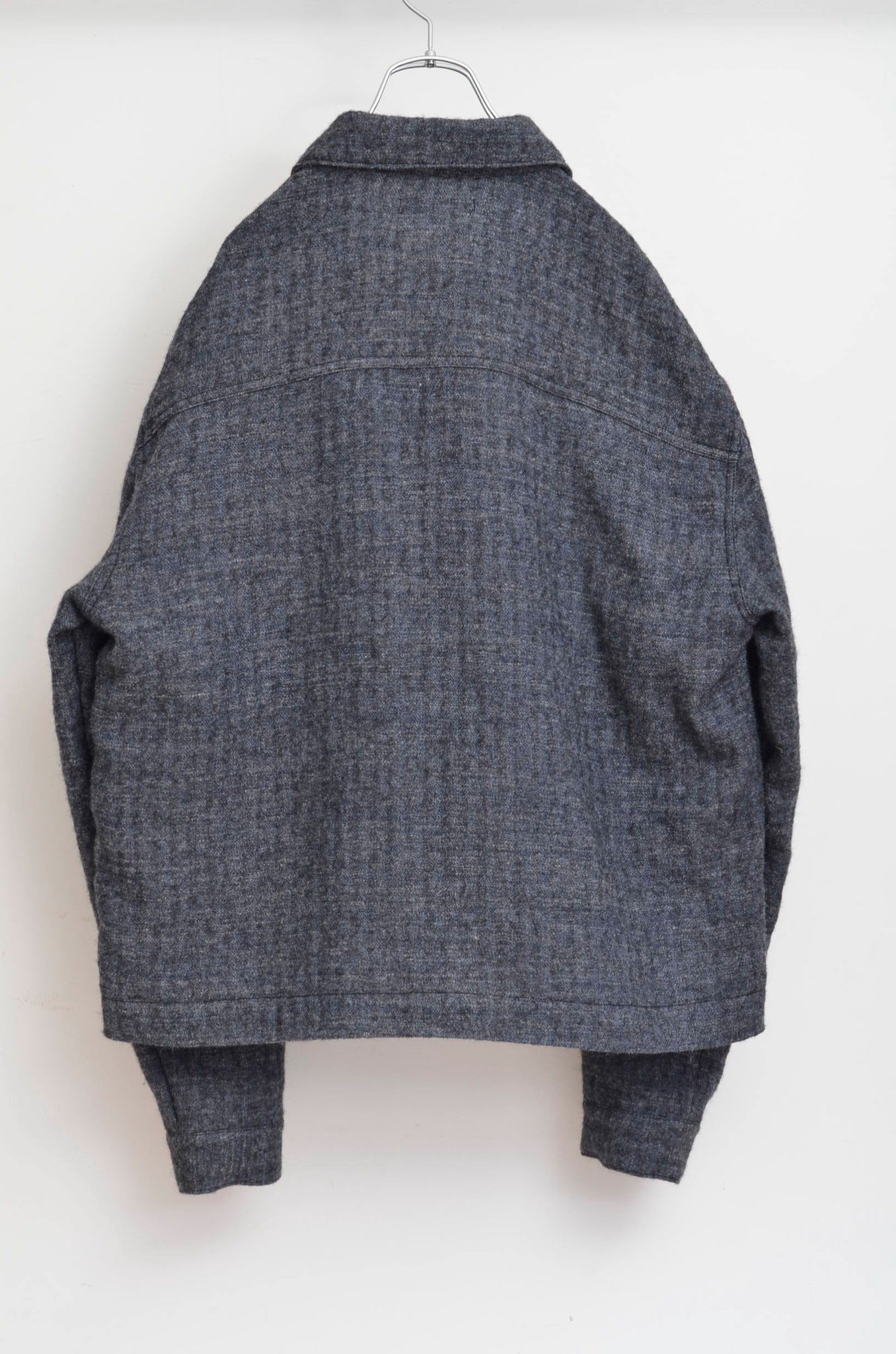 前身頃には、デッドストックのインテリアファブリックと合わせたキルト切り替えを施しています。