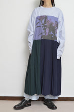 フォトグラファー東海林広太の今シーズンのイメージに合わせてセレクトされた「YURI」をインクジェットプリントしたオリジナルボディーのTシャツにusedプリーツSKをあわせたワンピース。