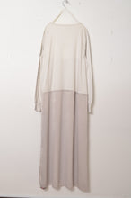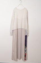 60/1コットンスムースのL/S Tにベルベットライクなスウェーディサテンを切り替えたロングワンピース。