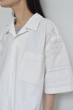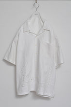 usedテーブルクロスを解体し、オリジナルパターンで仕立てた開襟シャツ。