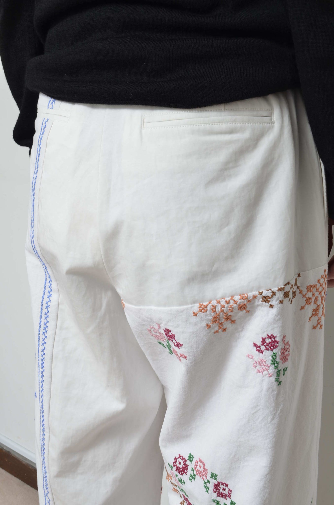 前開きはファスナーとホック。腰ポケットと後ろ玉縁ポケット付き。