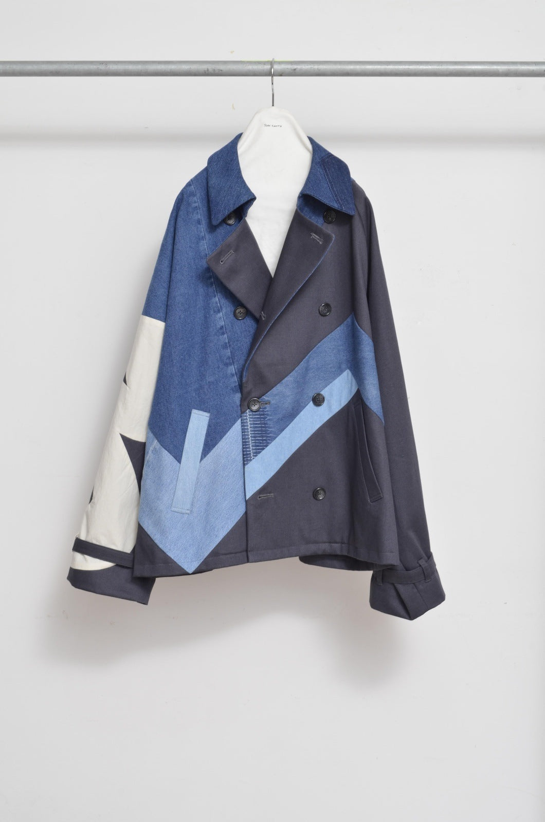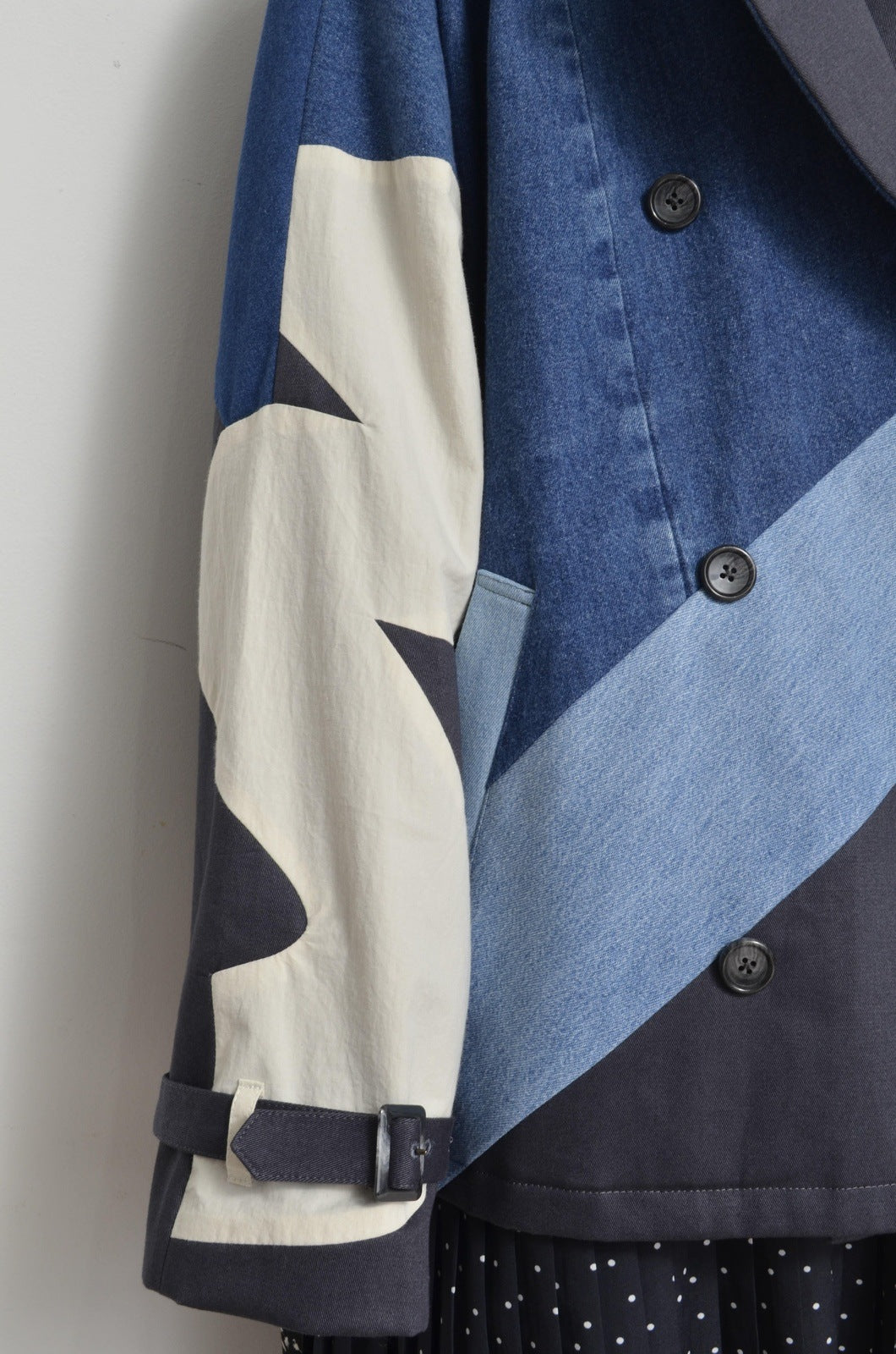 チノクロスをベースにUSEDデニムをシャープなラインで切り替えたトレンチコート。