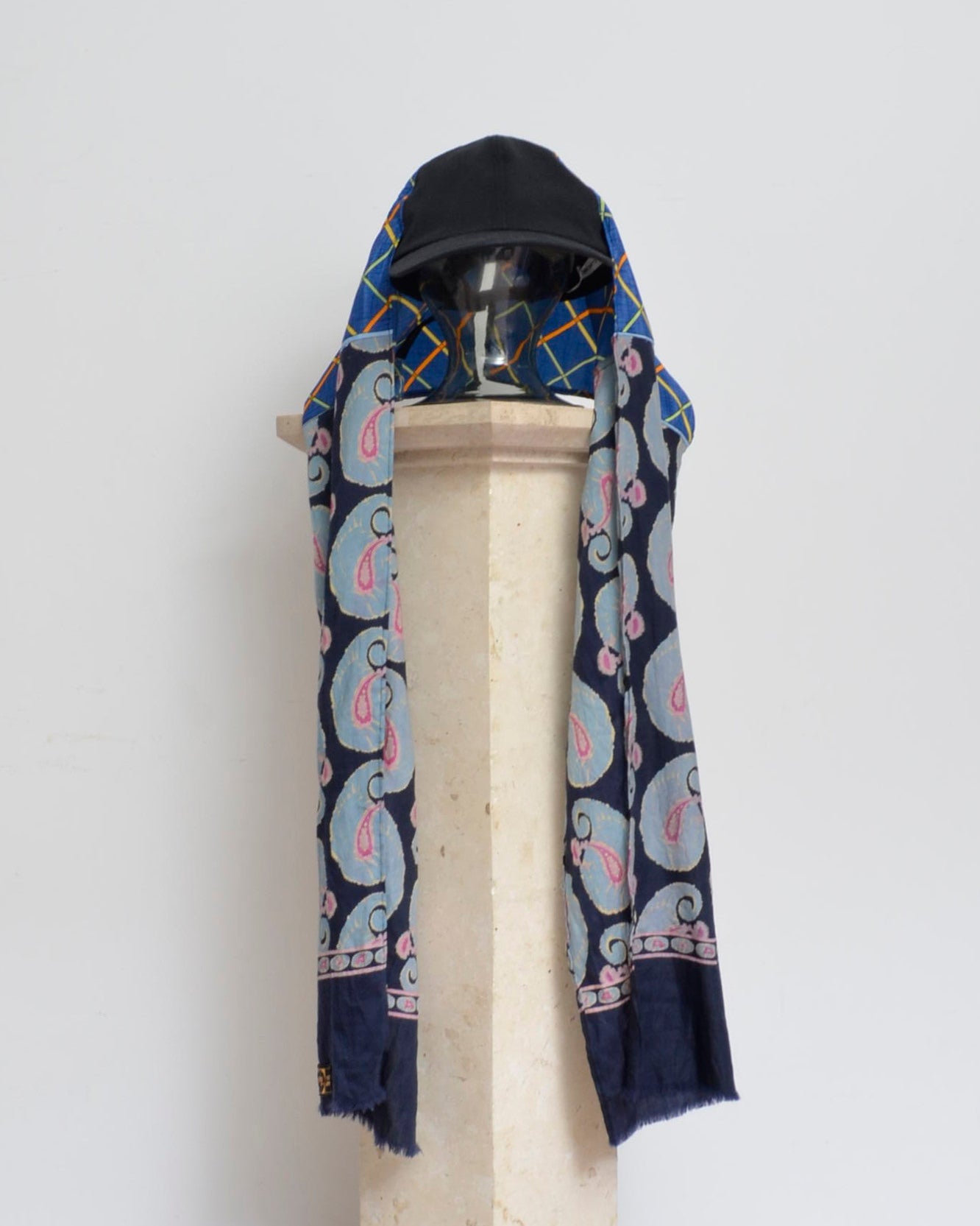 大判ストールを巻いているように被るテンセル6パネルキャップ。