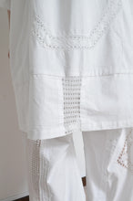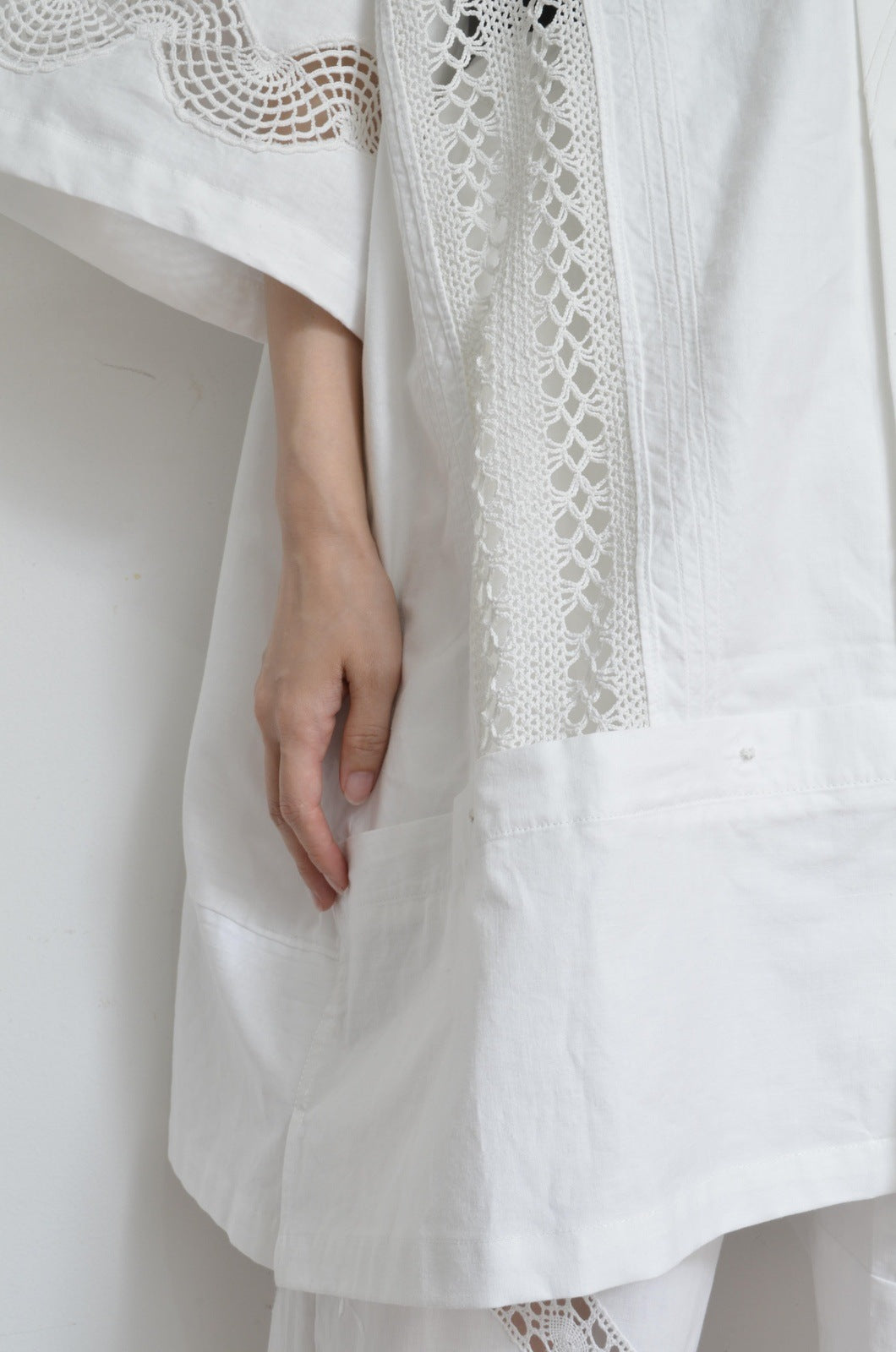 YEAH RIGHT!!では定番ながら年々貴重になってきているusedテーブルクロスを何種類も組み合わ せたシャツ。 様々な透け感のあるレース部分を随所に使っているので、肌の色やインナーの服の色味の合わせも楽しめるアイテム。