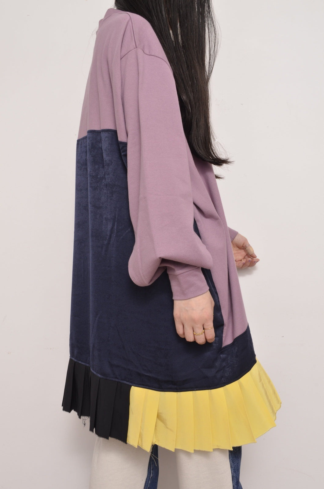 A cut-and-sew dress featuring slits under the sleeves.
