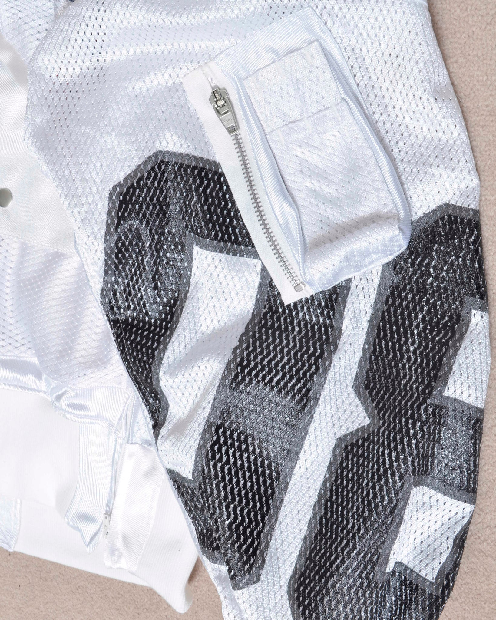 フットボールシャツを再構成したMA-1。 グラフィックの断片をそのまま残した一着。