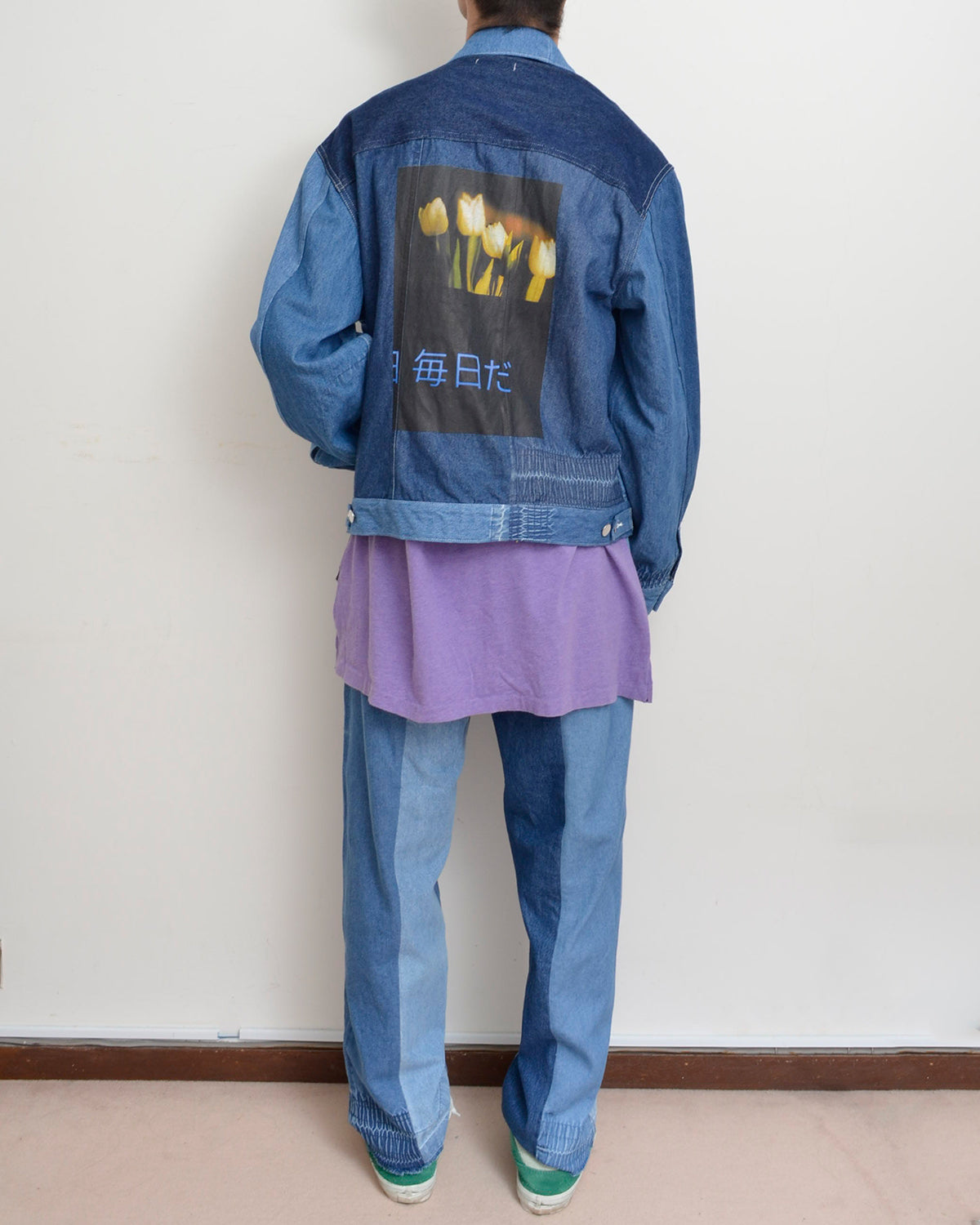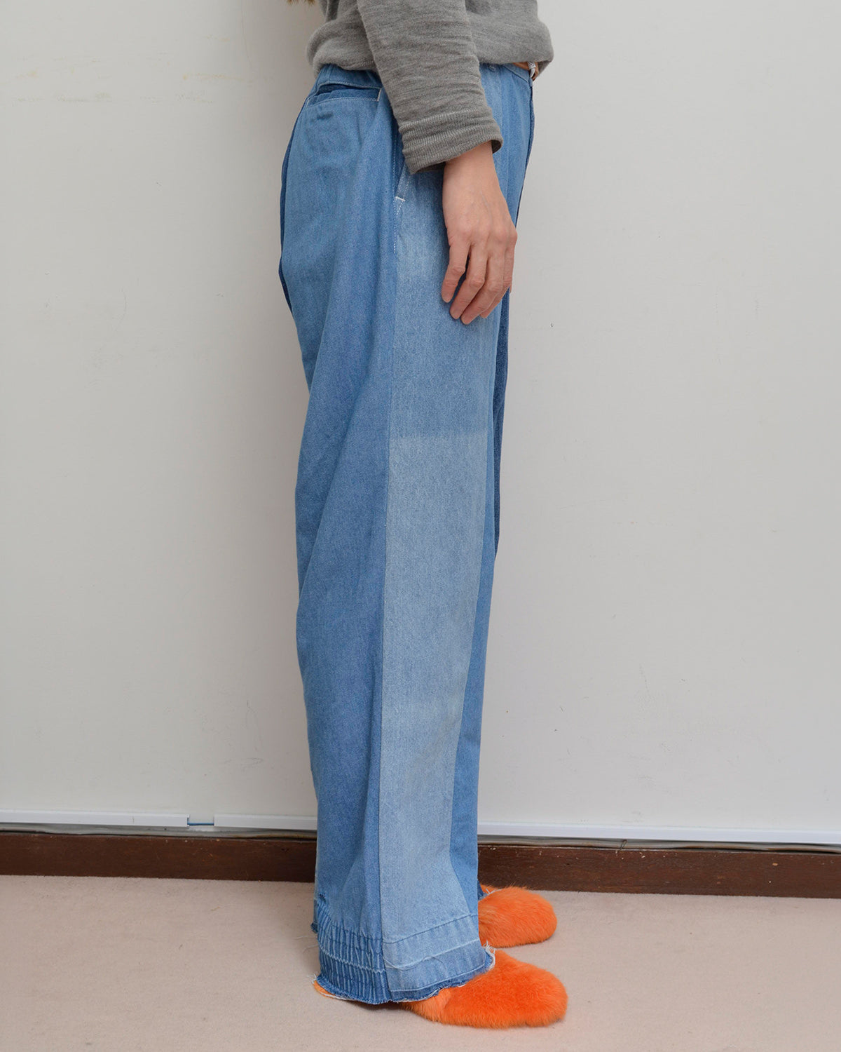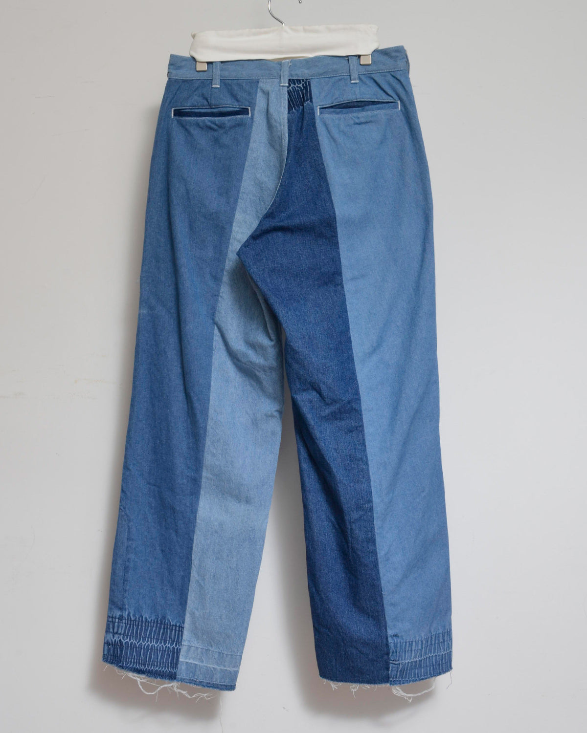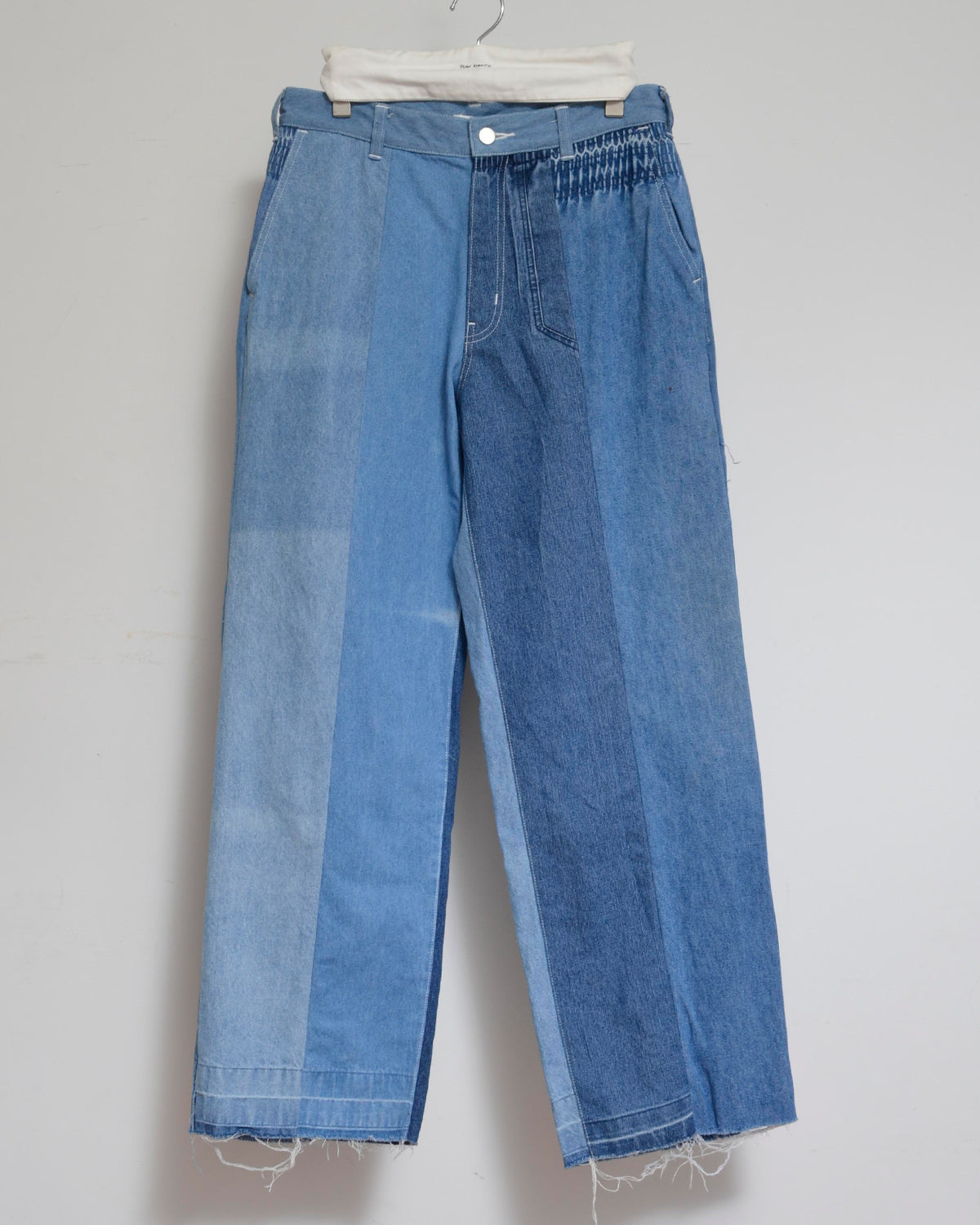 usedイージーパンツを解体・再構成し、ウエストゴムの痕跡を活かした独自のパネルワークがポイント。