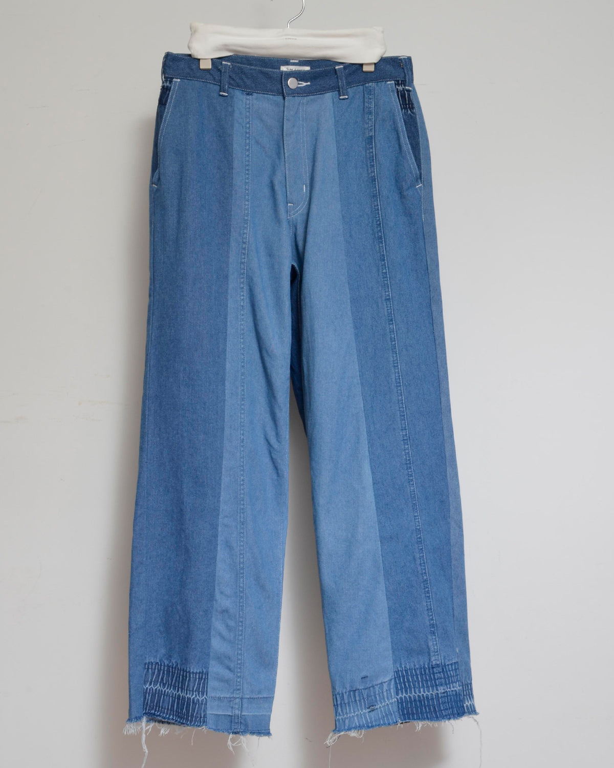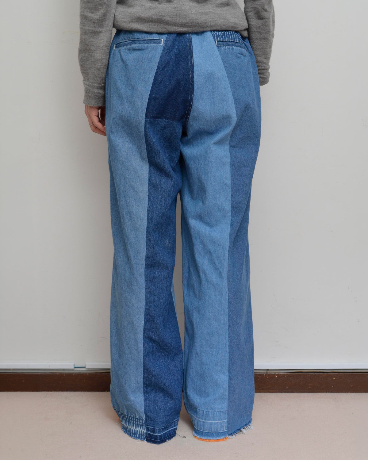 usedイージーパンツを解体・再構成し、ウエストゴムの痕跡を活かした独自のパネルワークがポイント。