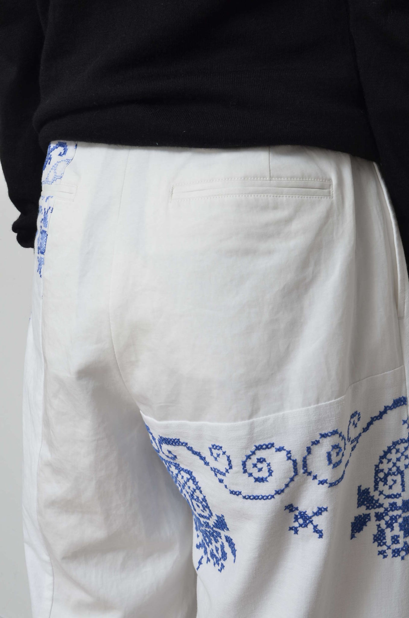 前開きはファスナーとホック。腰ポケットと後ろ玉縁ポケット付き。