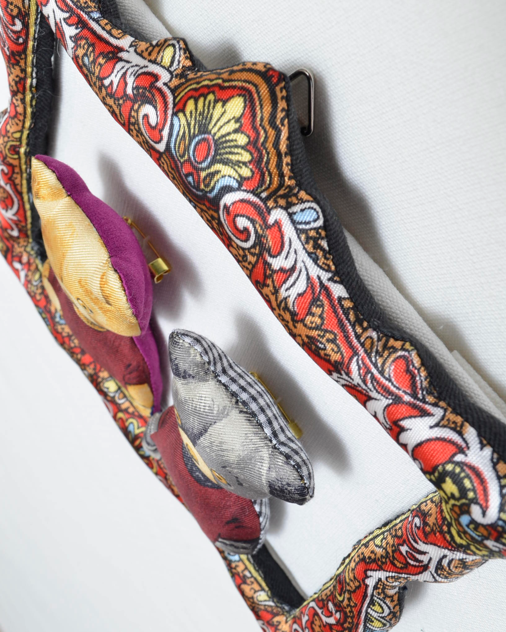 usedスカーフの特徴的できれいなペイズリーのような模様を切り抜いたフレームに、ぬいぐるみの2匹の熊のブローチが仲良くならんでいます。