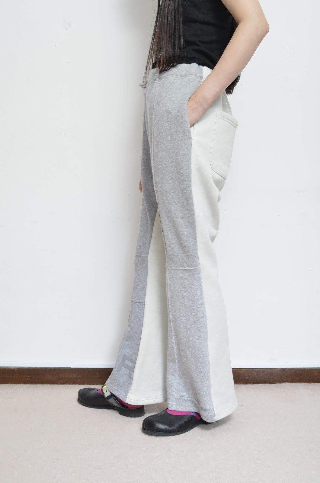 切り替え線やディティールは元のスウェットパンツ味を残しつつ、レッグラインがきれいに出るフレアパンツに仕立てました。