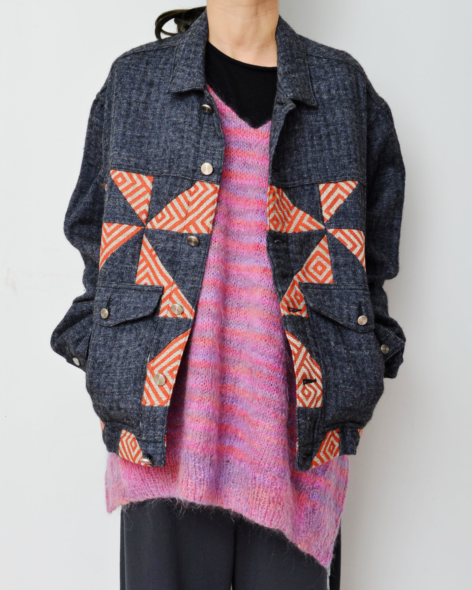 前後で種類の違うusedニットをかけ合わせている。