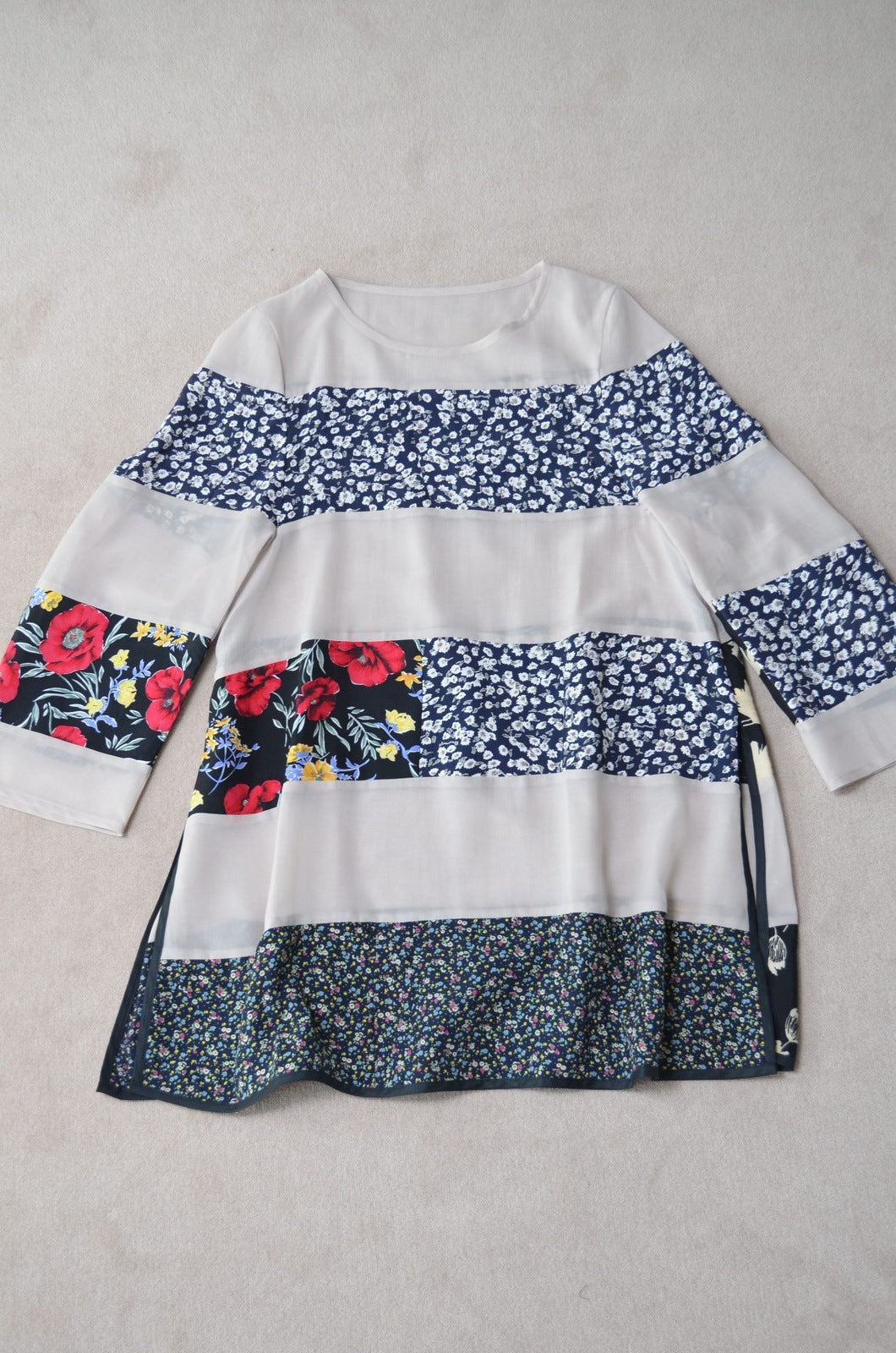 キュプラ/コットン素材の透け感があり柔らかな風合いながら、しっかりしたシフォン生地とused花柄スカートをボーダー状に切り替えた存在感のあるワンピース。
